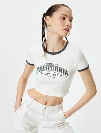 Kolej Crop Tişört Slim Fit Biyeli Kısa Kollu Bisiklet Yaka Pamuklu