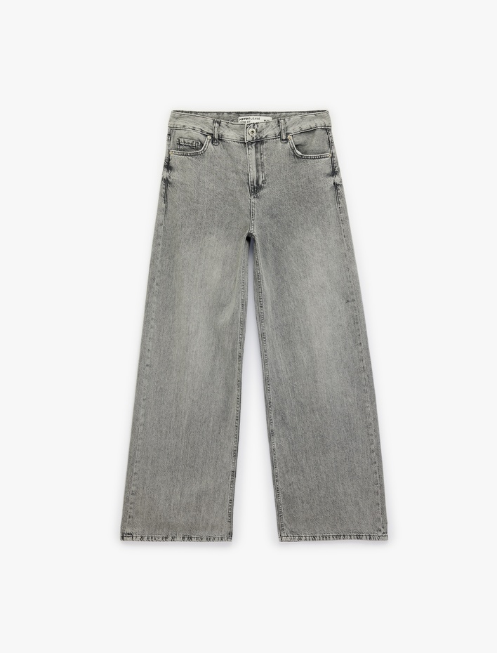 Düşük Bel Pamuklu Düğmeli Bol Kalıp Denim Pantolon - Loose Straight Fit Jean Sepete Ekle