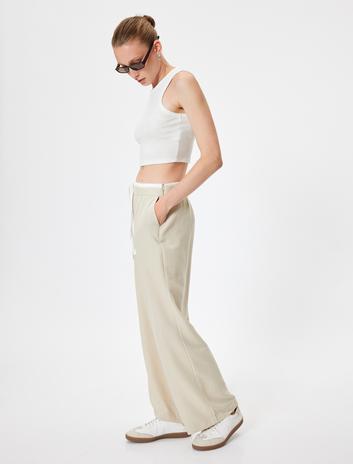 Beli Bağcıklı Cepli Yüksek Bel Düz Bol Paça Triko Pantolon