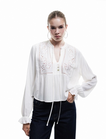 Kolsuz Astarlı Slim Fit Fistolu Brodeli Fırfırlı Omzu Açık Crop Bluz