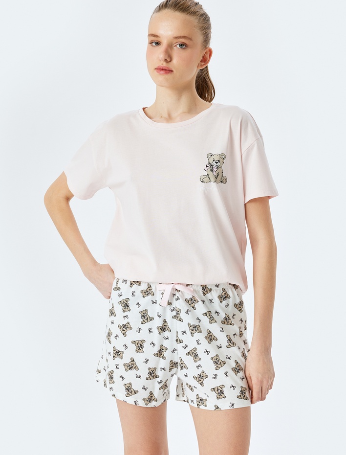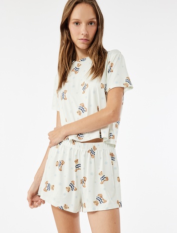 Pamuklu Kısa Kollu Ayıcık Baskılı Şortlu Pijama Takımı Sepete Ekle