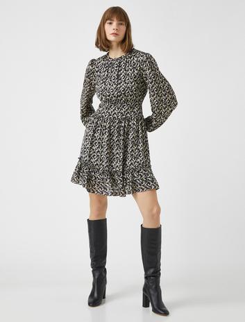 Bisiklet Yaka Uzun Kollu Şal Desenli Kısa Elbise