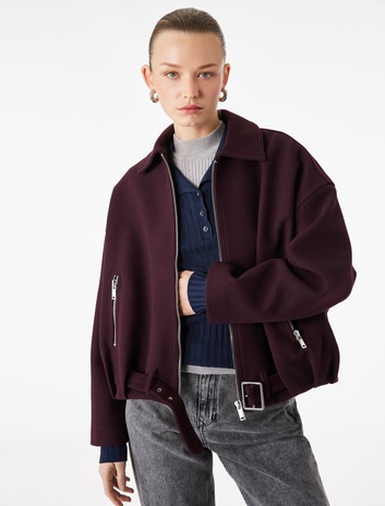 Uzun Kollu Cepli Fermuarlı Kemerli Oversize Kaşe Bomber Ceket Sepete Ekle