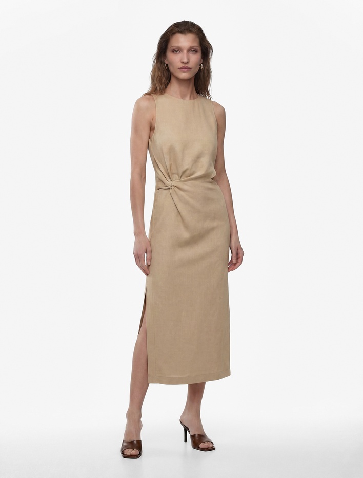 Yırtmaçlı Kolsuz Yuvarlak Yaka Pencere ve Düğüm Detaylı Keten Elbise