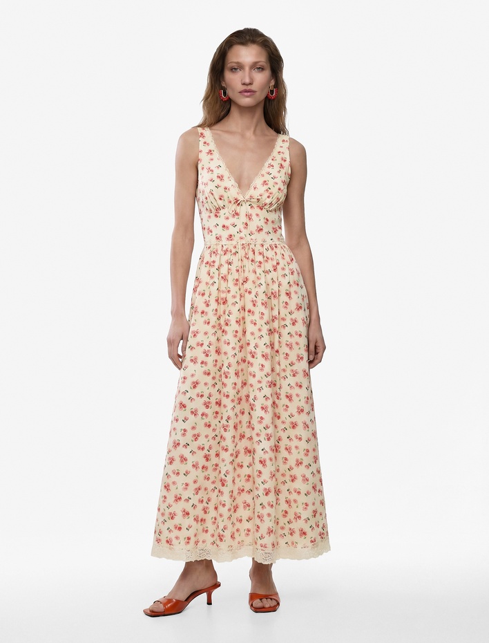 Viskon Kumaş Fiyonk ve Dantel Detaylı V Yaka Kalın Askılı Çiçekli Uzun Elbise