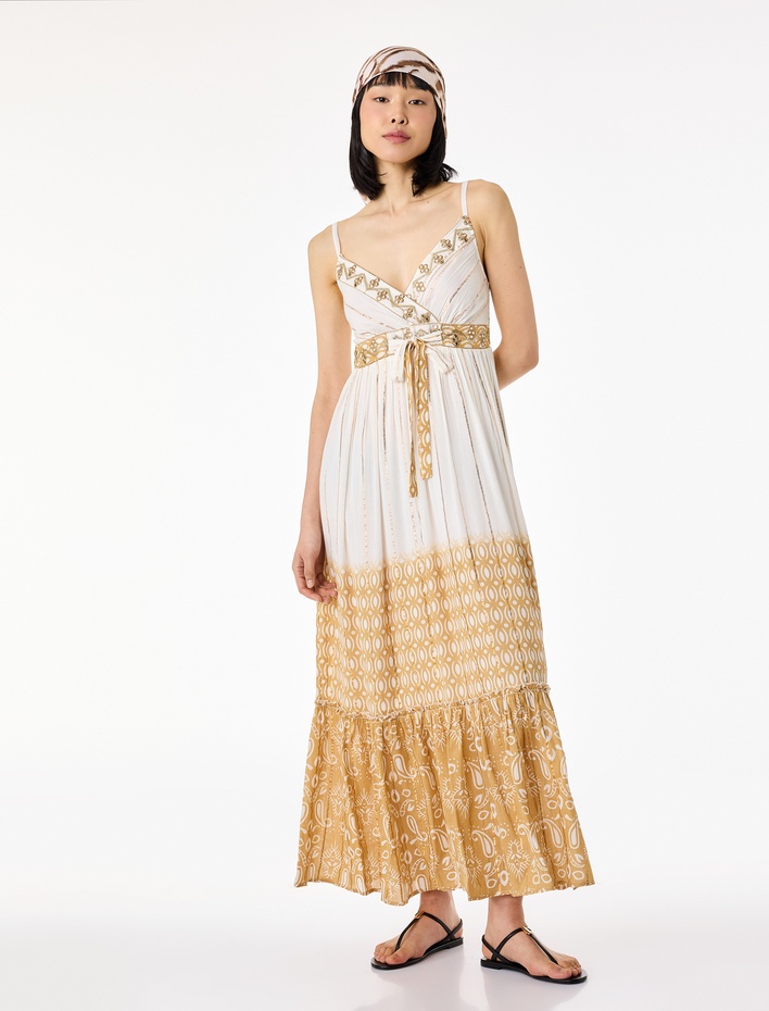 Bağlama Detaylı Etnik Desenli Parıltılı Uzun İnce Askılı Elbise