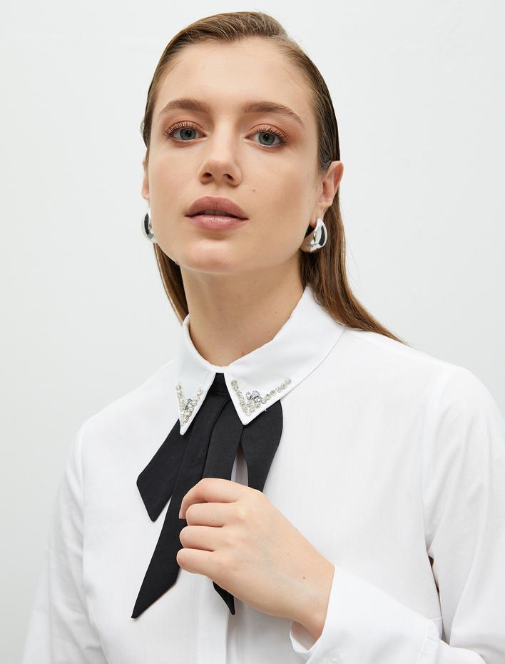 Taşlı Gömlek Fular Yaka Uzun Kollu Düğmeli Sepete Ekle