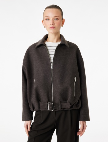 Uzun Kollu Kemer Detaylı Cepli Fermuarlı Oversize Kaşe Bomber Ceket Sepete Ekle
