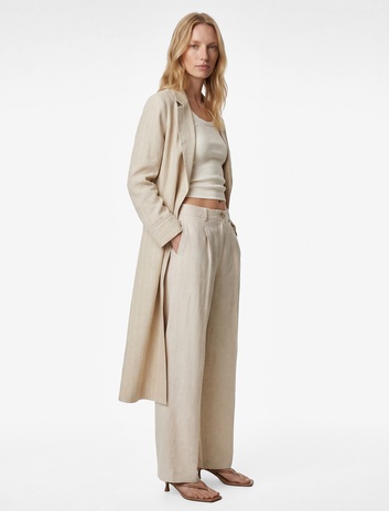 Keten Karışımlı Uzun Kollu Cepli Çizgili Kruvaze Uzun Ceket