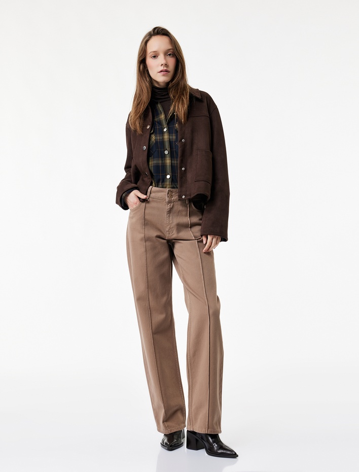 Pile Detaylı Cepli Geniş Paça Kumaş Pantolon
