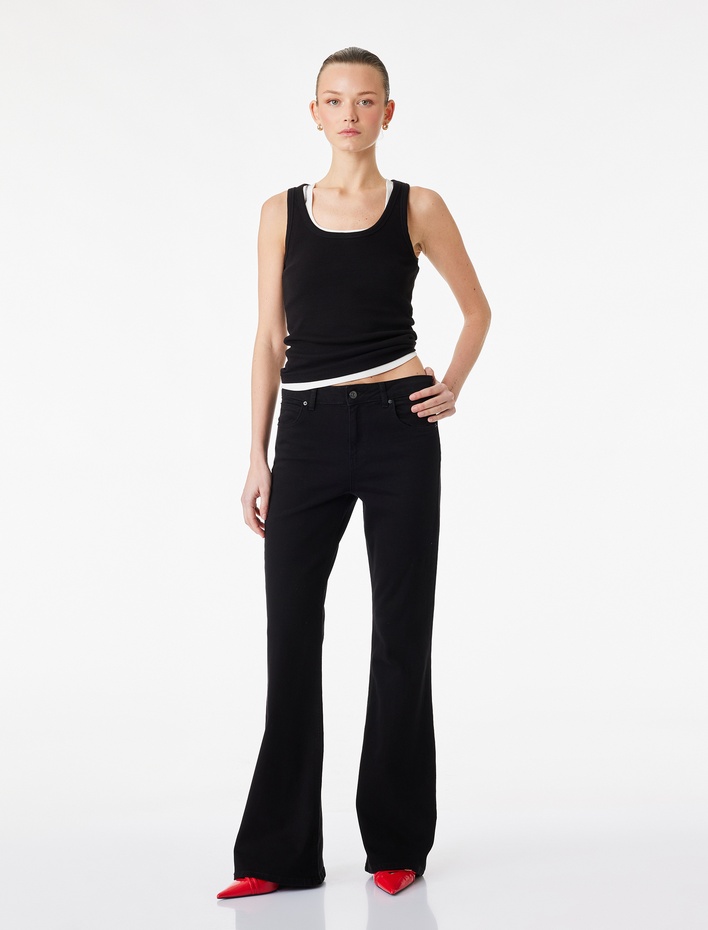 Yüksek Bel Slim Fit Cepli Düğmeli Pamuklu İspanyol Paça Denim Pantolon - Flare Jeans Sepete Ekle