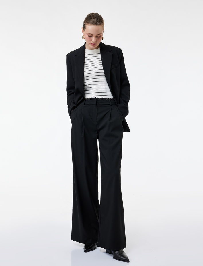 Pile Detaylı Cepli Yüksek Bel Palazzo Kumaş Pantolon