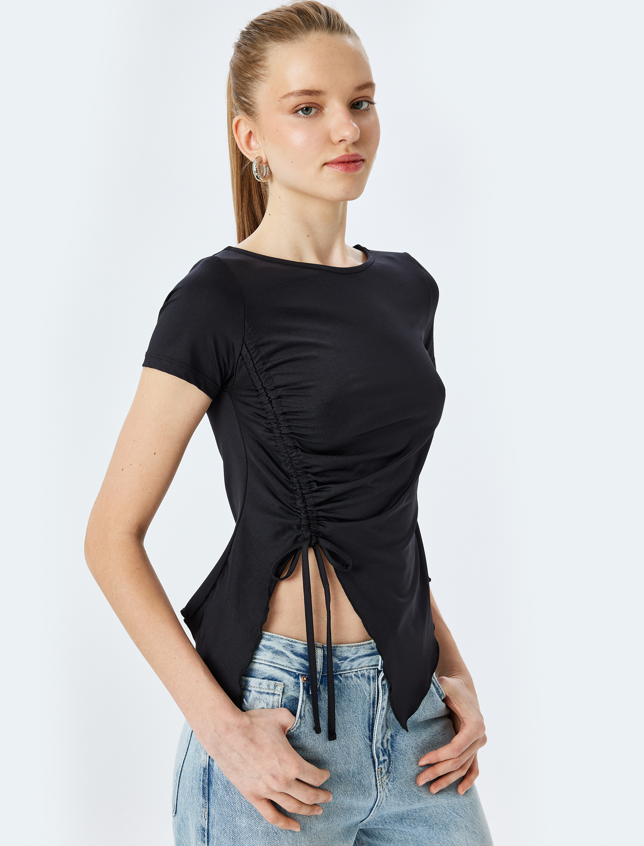 Büzgülü Bisiklet Yaka Kısa Kollu Asimetrik Tişört
