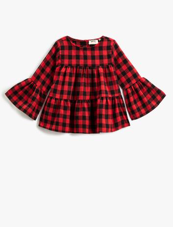 Kız Çocuk Geniş Uzun Kollu Ekose Bluz Bisiklet Yaka