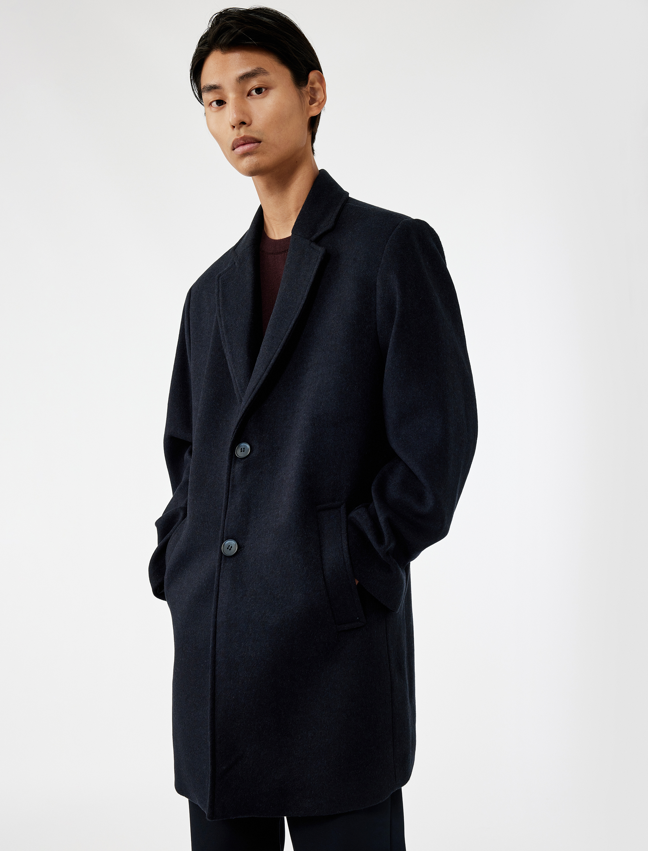 Cep Detaylı Uzun Kollu Düğmeli Dar Kalıp Kruvaze Yaka Kaşe Kaban