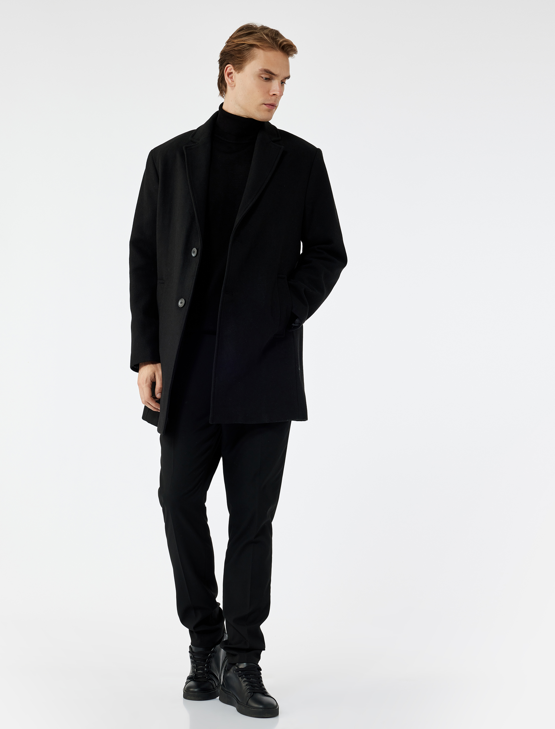 Cep Detaylı Uzun Kollu Düğmeli Dar Kalıp Kruvaze Yaka Kaşe Kaban