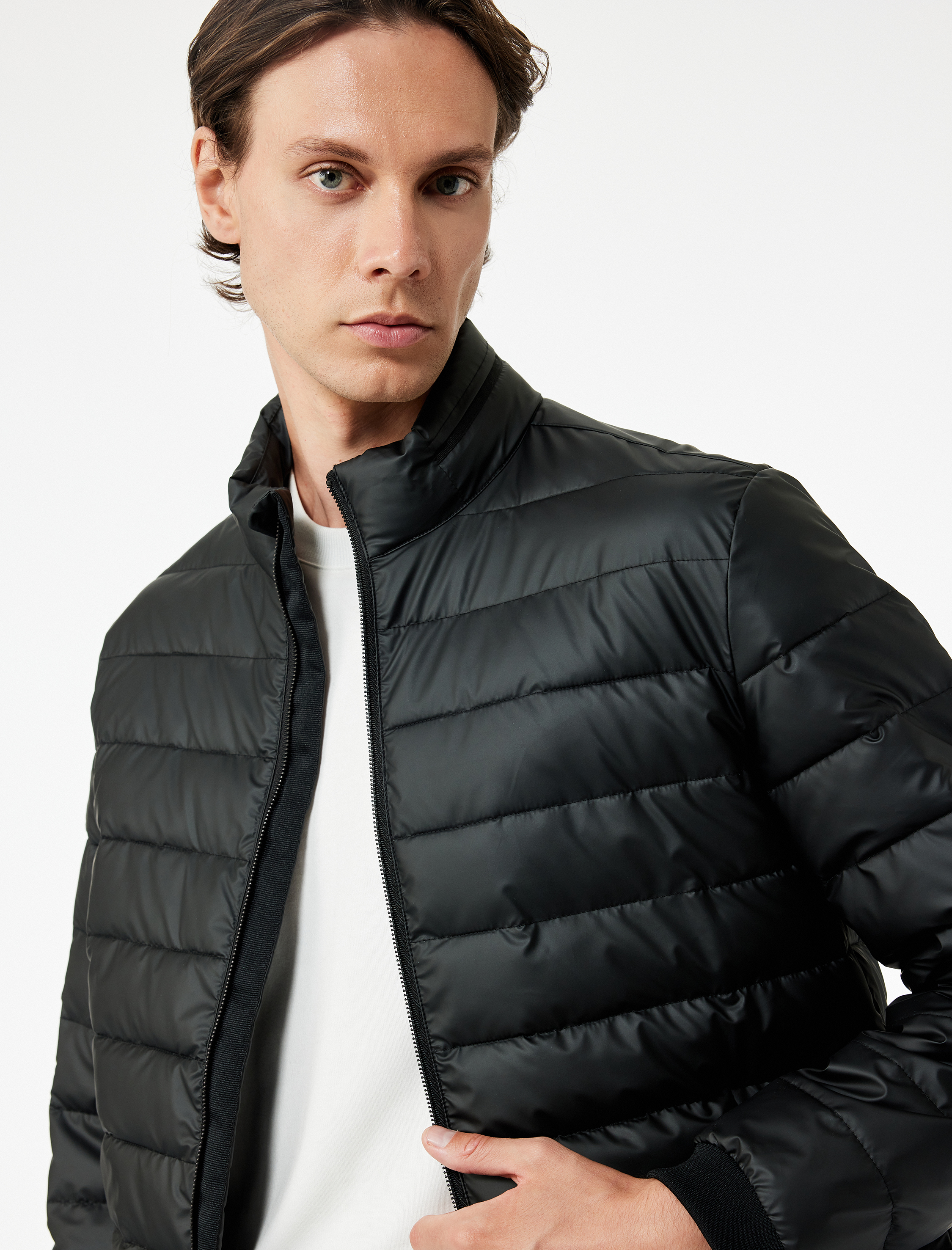 Cep Detaylı Uzun Kollu Fermuarlı Dik Yaka Şişme Mont