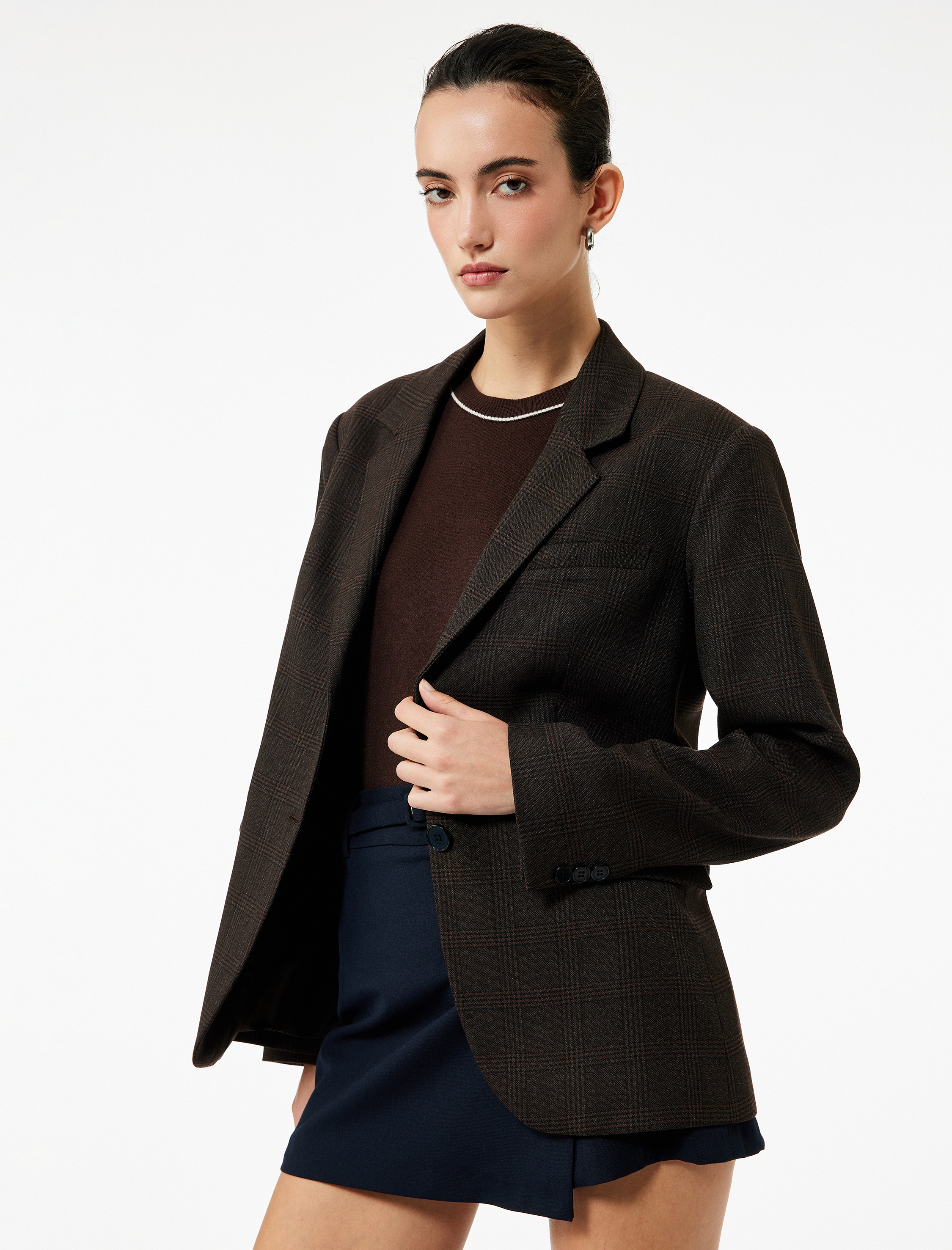 Cepli Düğmeli Uzun Kollu Kruvaze Ekose Blazer Ceket