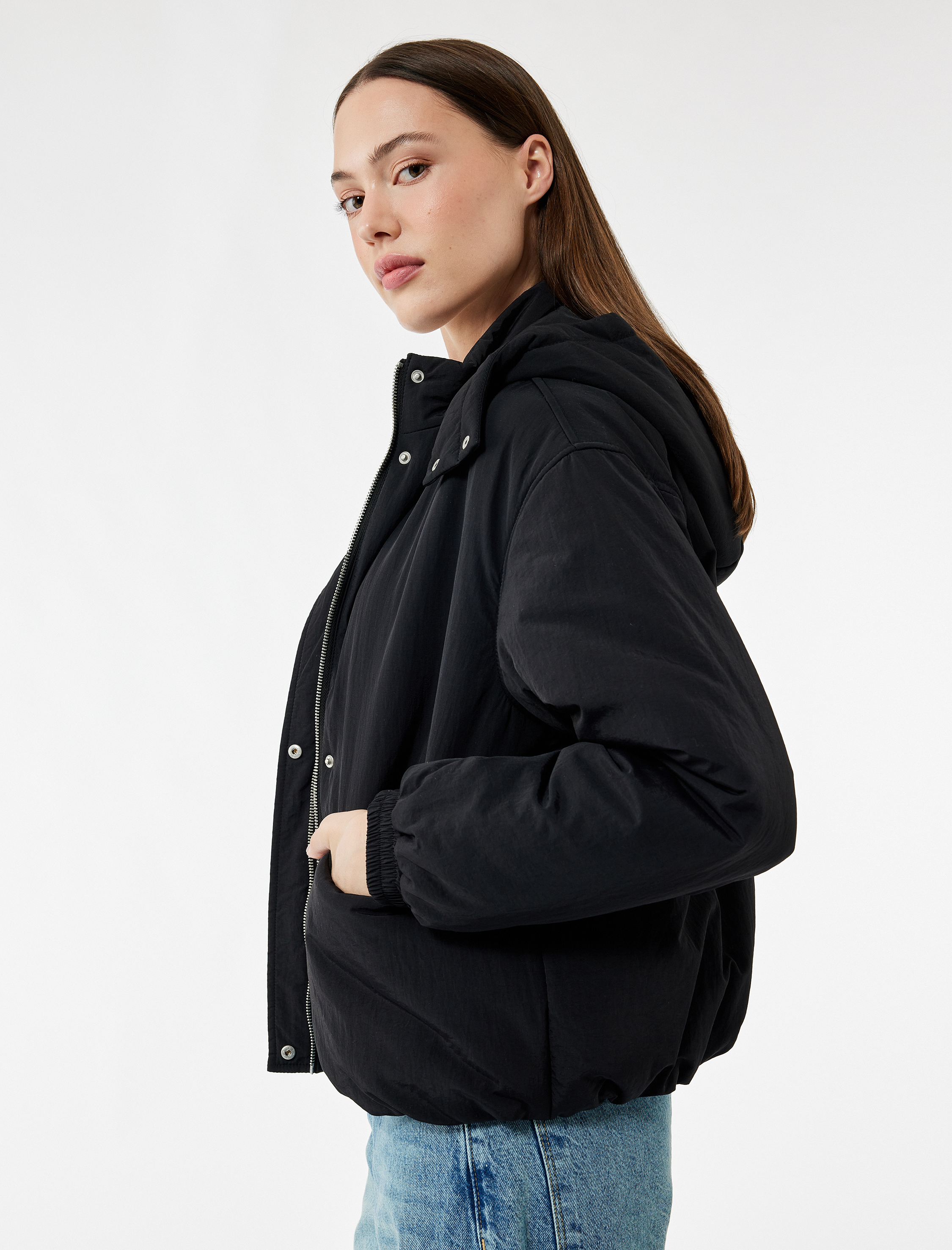 Cepli Fermuarlı Su İtici Uzun Kollu Kapüşonlu Kısa Şişme Mont