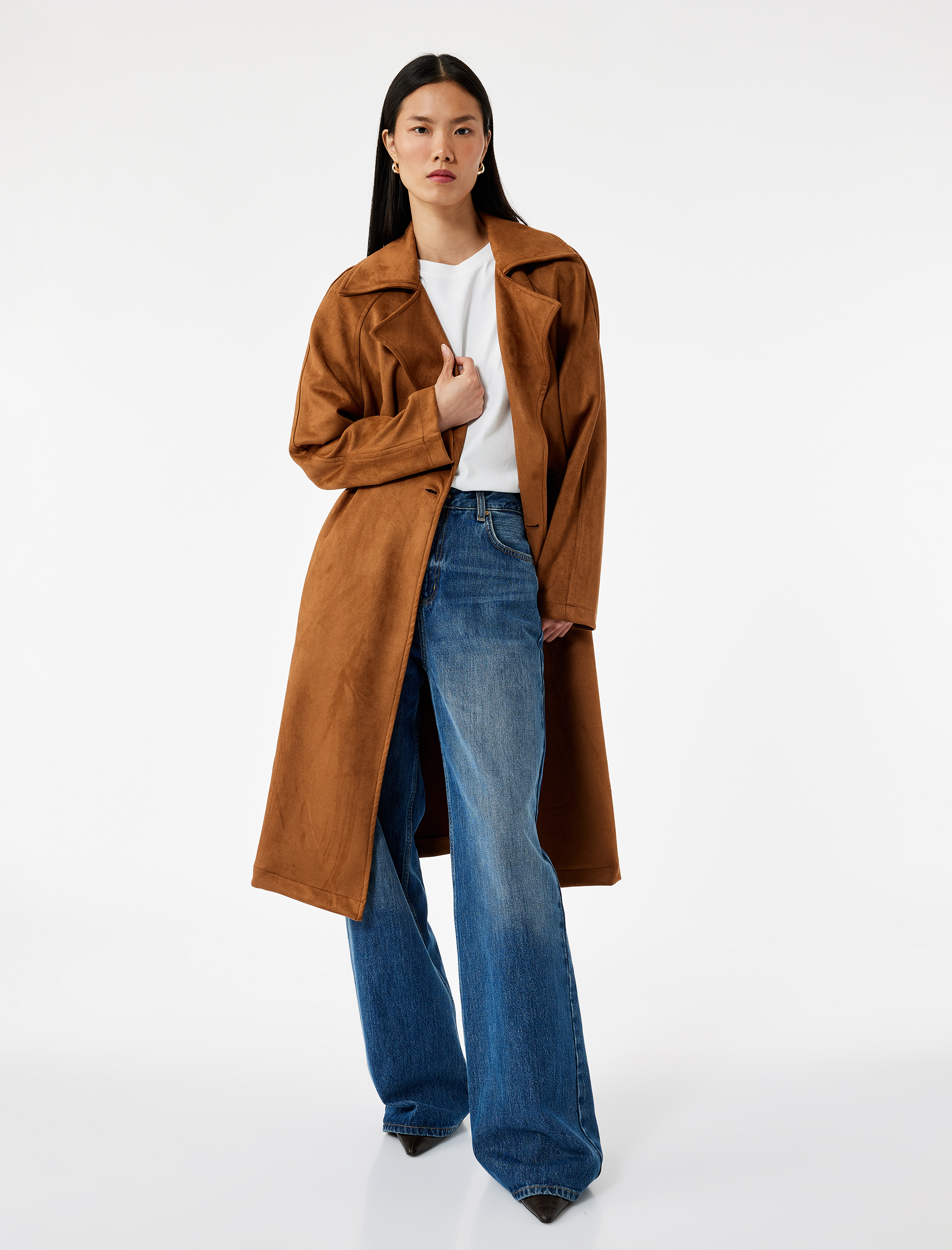 Cepli Kruvaze Yaka Kemerli Uzun Suni Süet Trençkot