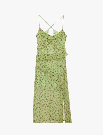 Asimetrik Kesim Fırfır Detaylı İp Askılı Uzun Çiçekli Tül Elbise