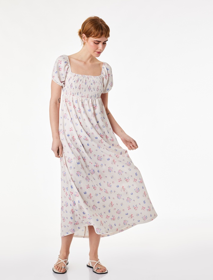 Pamuklu Kısa Balon Kollu U Yaka Gipeli Çiçekli Maxi Elbise