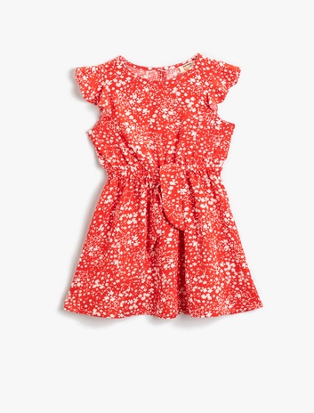Kız Çocuk Elbise Kelebek Kol Beli Lastikli Kemer Detaylı Bisiklet Yaka Çiçek Desenli