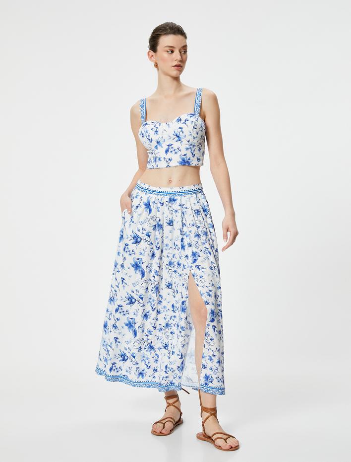 Midi Çiçekli Etek Yırtmaç Detaylı Viskoz Kumaş Sepete Ekle