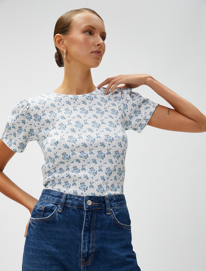 Çiçekli Bluz Bisiklet Yaka Kısa Kollu Standart Kesim