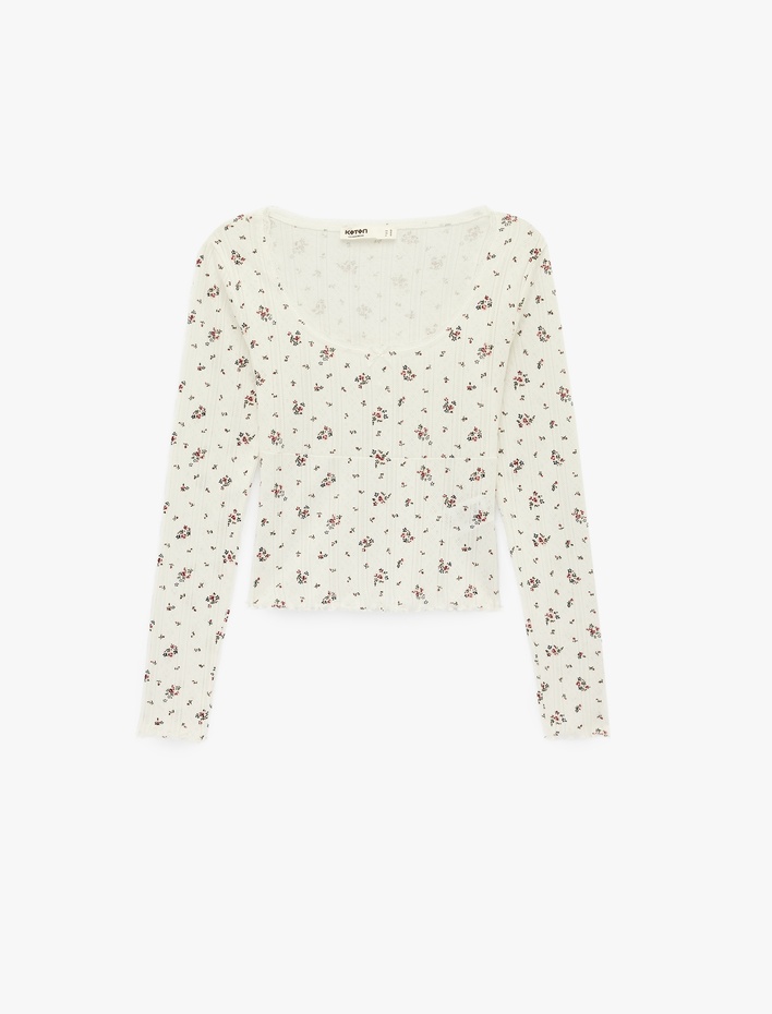 Uzun Kollu Slim Fit Kare Yaka Pamuklu Çiçekli Örme Crop Pijama Üstü Sepete Ekle