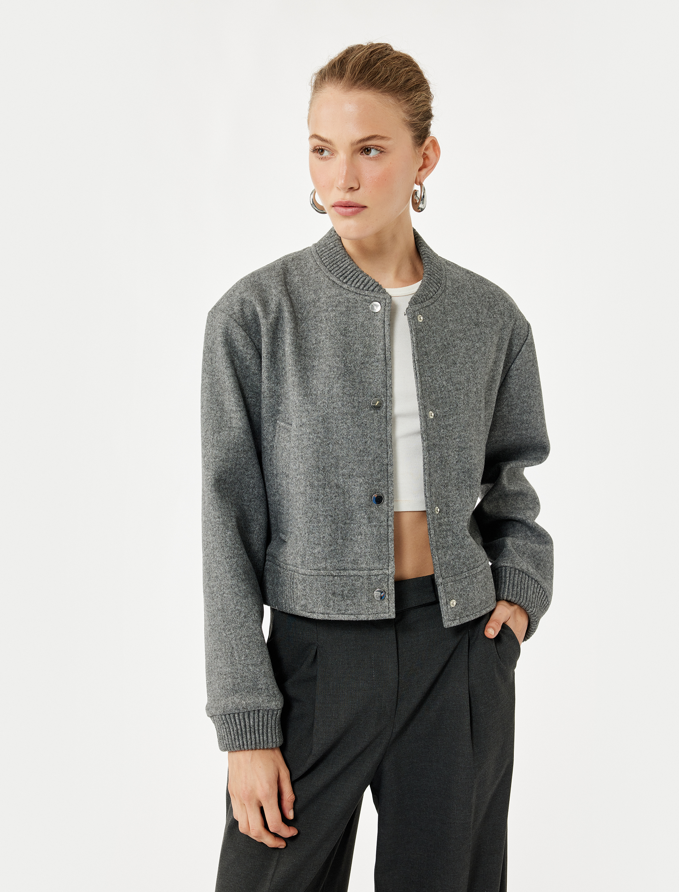 Çıtçıt Kapama Detaylı Uzun Kollu Kolej Yaka Cepli Crop Bomber Ceket