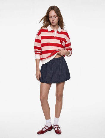 Polo Yaka Düğmeli Uzun Kollu Oversize Kalpli Çizgili Sweatshirt