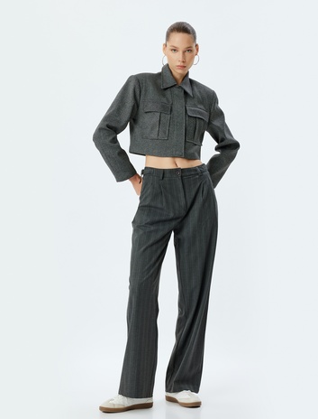 Crop Gömlek Uzun Kollu Klasik Yaka Düğmeli Cep Detaylı
