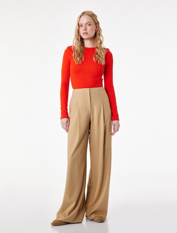 Pile Detaylı Bol Paça Çizgili Kumaş Pantolon
