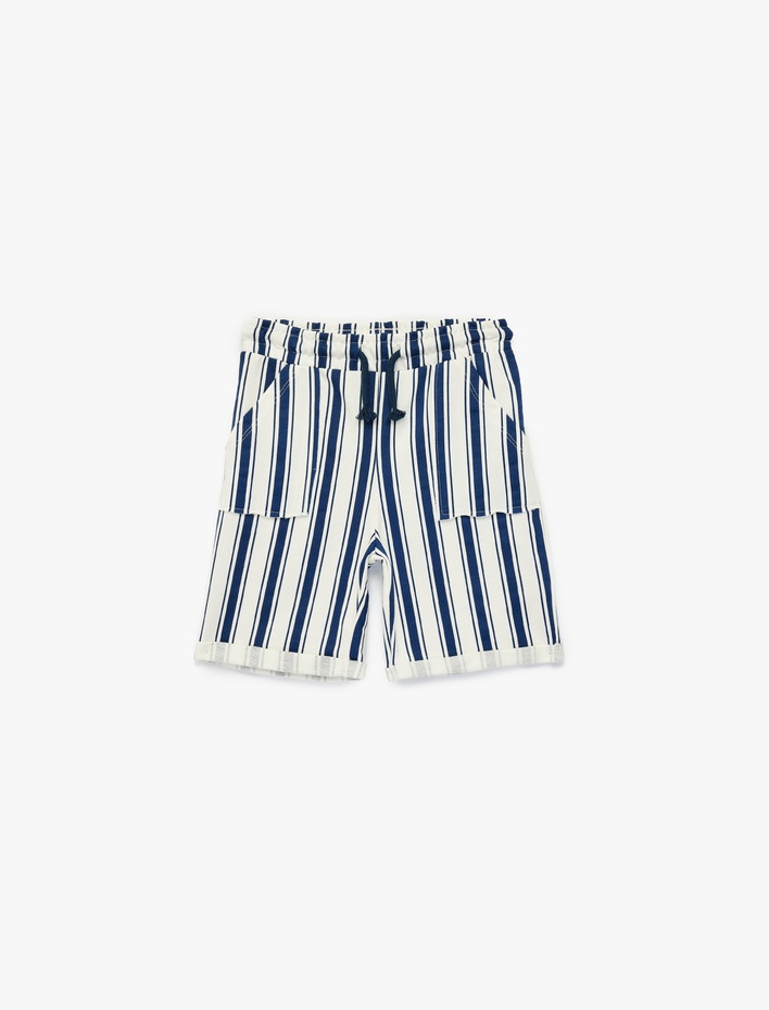 Pamuklu Beli Bağcıklı Cep Detaylı Çizgili Şort Sepete Ekle