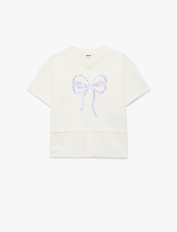 Pamuklu Kısa Kollu Bisiklet Yaka Fiyonk Baskılı Tişört Sepete Ekle