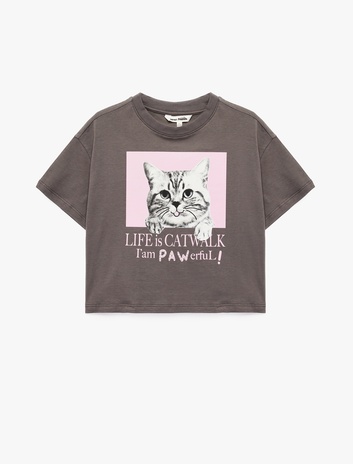 Bisiklet Yaka Kısa Kollu Pamuklu Kedi Baskılı Tişört Sepete Ekle