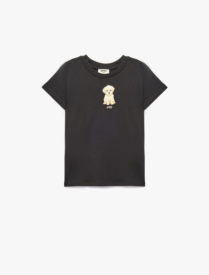 Kısa Kollu Bisiklet Yaka Köpek Nakış Detaylı Pamuklu Tişört Sepete Ekle