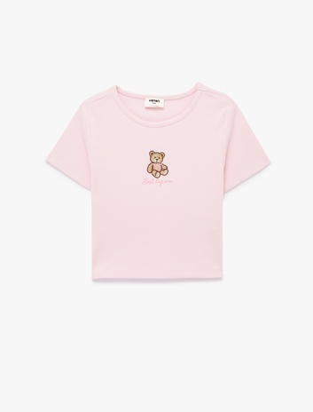 Ayıcık Nakışlı Kısa Kollu Bisiklet Yaka Pamuklu Tişört Sepete Ekle