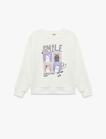 Kız Çocuk Uzun Kollu Bisiklet Yaka Kedi Baskılı Şardonlu Sweatshirt
