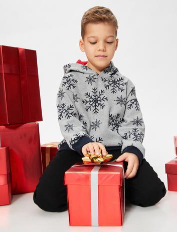 Erkek Çocuk Kapüşonlu Sweatshirt Yılbaşı Temalı Kar Tanesi Baskılı