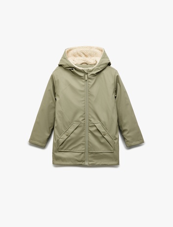 Erkek Çocuk Peluş Detaylı Uzun Kollu Fermuarlı Cepli Uzun Kapşonlu Şişme Mont