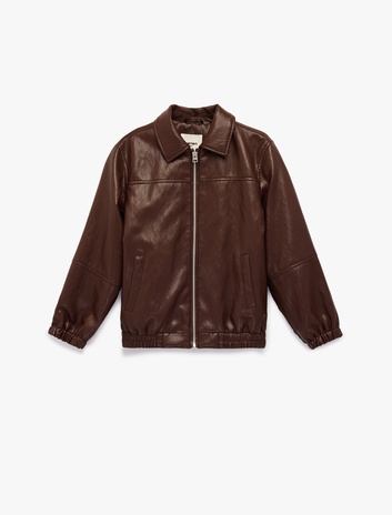 Erkek Çocuk Uzun Kollu Bisiklet Yaka Fermuar Detaylı Suni Deri Kolej Ceket