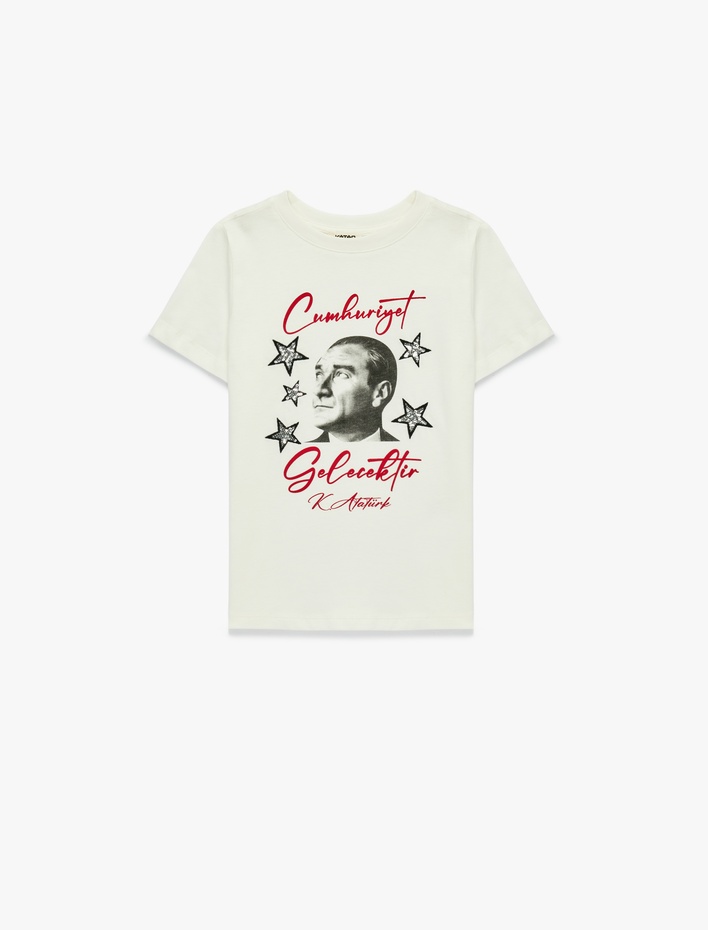Atatürk Nakış Detaylı Bisiklet Yaka Kısa Kollu Pamuklu Tişört Sepete Ekle