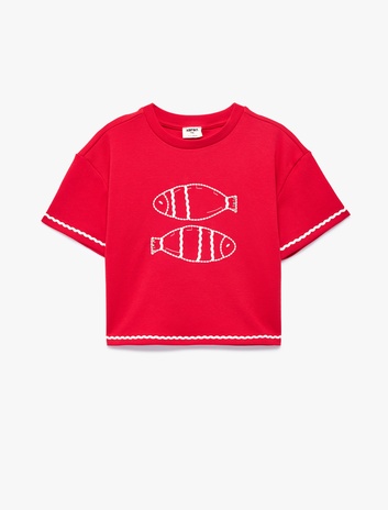 Nakışlı Kısa Kollu Bisiklet Yaka Pamuklu Tişört Sepete Ekle
