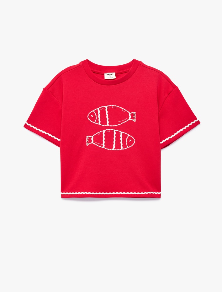 Balık Baskılı Bisiklet Yaka Kısa Kollu Pamuklu Tişört Sepete Ekle