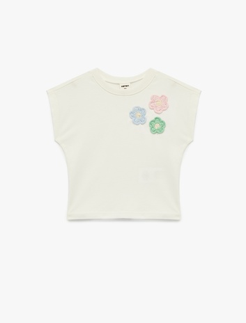 Pamuklu Çiçekli Aplike Detaylı Kolsuz Bisiklet Yaka Tişört Sepete Ekle