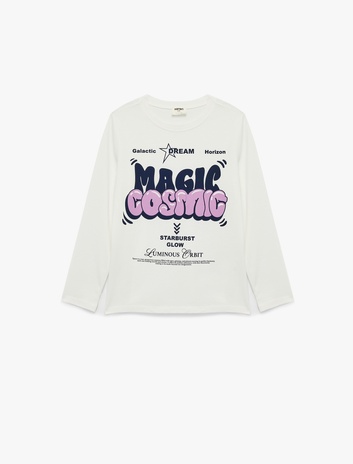 Kız Çocuk Pamuklu Bisiklet Yaka Uzun Kollu Baskılı Tişört