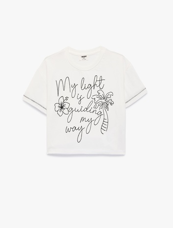 Pamuklu Kısa Kollu Bisiklet Yaka Nakışlı Tişört Sepete Ekle