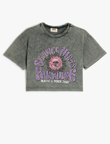 Kız Çocuk Baskılı Bisiklet Yaka Kısa Kollu Crop Tişört